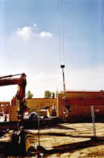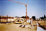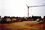 Stützen im linken Gebäudekomplex werden für die Zwischendecke gesetzt. Hier kann dann eine spätere Aufstockung für das Staffelgeschoßgebäude bis zu 4,5 Etagen erfolgen.